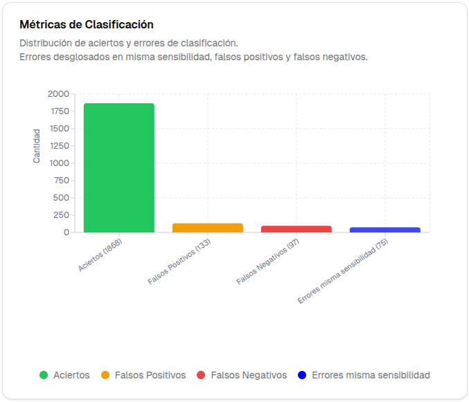En el gráfico siguiente se desglosa la clasificación obtenida en cantidad de aciertos, falsos positivos, falsos negativos y errores de clasificación entre categorías de igual sensibilidad.